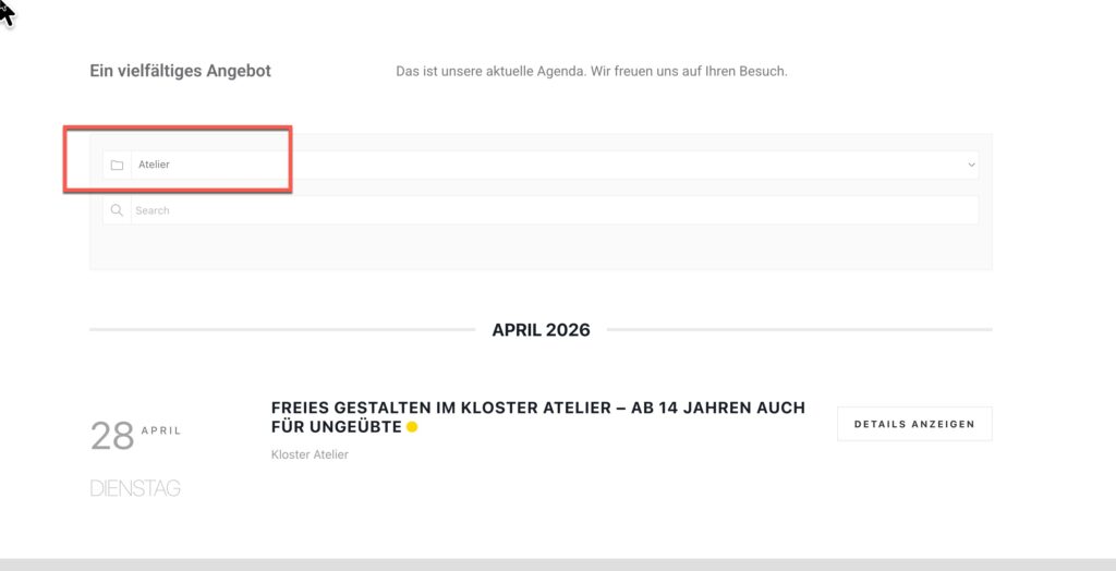 Mit dem Suchbegriff „Atelier“ in der Webagenda, werden alle Kreativangebote angezeigt. Diese sind mit einem gelben Punkt in der Agenda markiert. Übrige Anlässe sind mit grünem Punkt markiert.